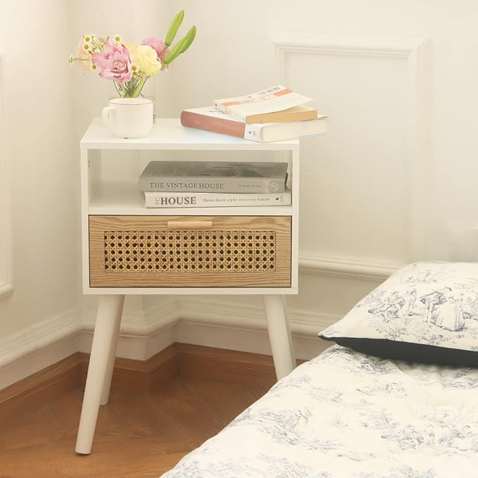 MaxSmeo White Nightstand with Drawer, Mid Century Modern Nightstand, Rattan Side Table, End Table with Storage for Living Room, Bedroom and Small Spaces, Easy Assembly (White)