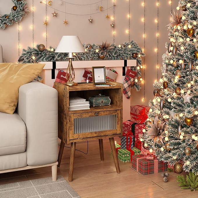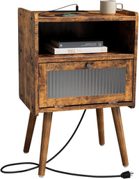 Mid Century Modern Nightstand with Charging Station, Bedside Tables with Glass Door, End Table Side Table with 2 Tiers Storage Space, for Bedroom, Living Room, Brown
