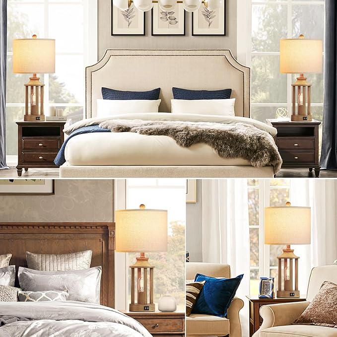 Touch Control Farmhouse Table Lamp Set of 2 with 2 USB Ports, 3 Way Dimmable Bedside Lamps with 2 LED Nightlight,Rustic Nightstand Lamps for Bedroom, Living Room Office (4 LED Bulbs Included)