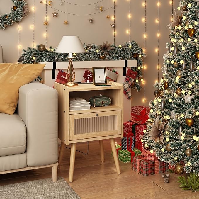 Mid Century Modern Nightstand with Charging Station, Bedside Tables with Glass Door, End Table Side Table with 2 Tiers Storage Space, for Bedroom, Living Room, Natural