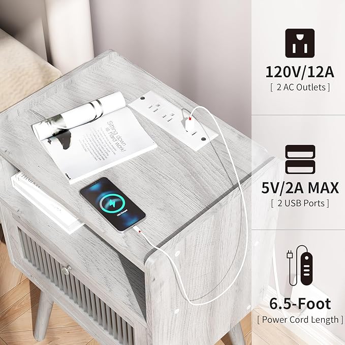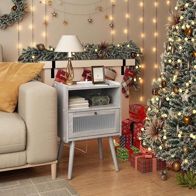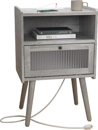 Mid Century Modern Nightstand with Charging Station, Bedside Tables with Glass Door, End Table Side Table with 2 Tiers Storage Space, for Bedroom, Living Room, Light Grey