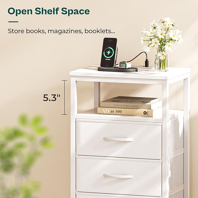 Huuger Nightstands Set of 2, 27.6 Inch End Tables with Charging Station, Bedside Tables with Drawers, PU Leather Finish, USB Port and Outlet, Night Stands for Bedroom, White