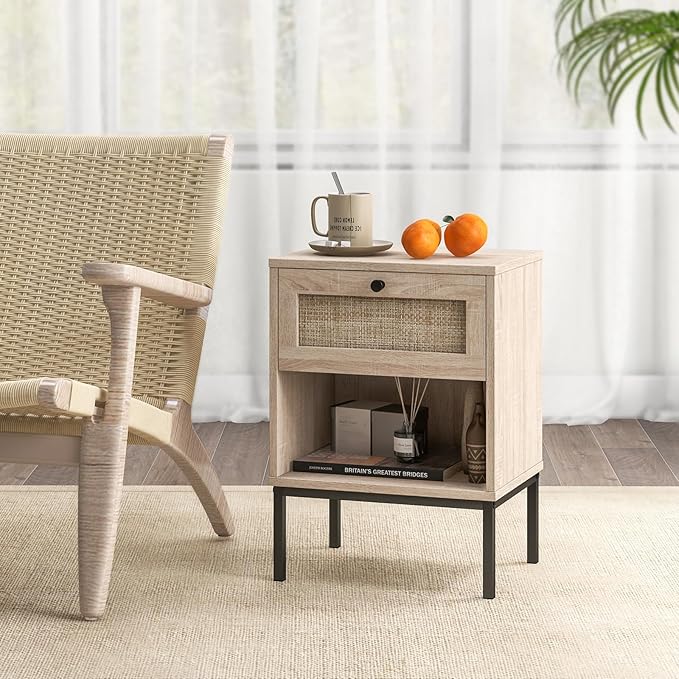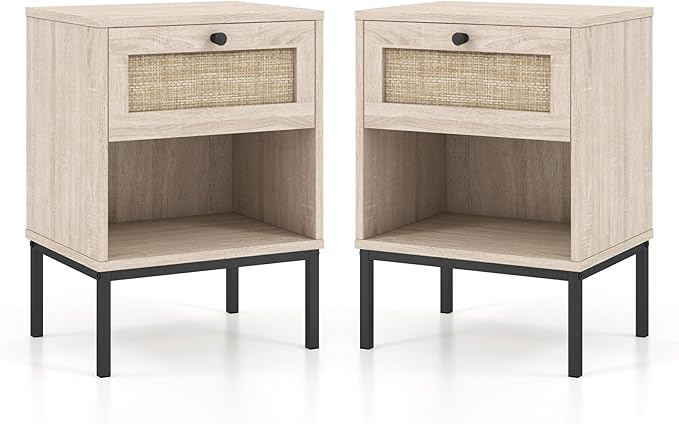 Giantex Rattan Nightstands with Drawer Set of 2, Boho Side Tables with 4 Metal Legs and Open Storage Shelf, Farmhouse Night Stands for Small Spaces, 2 Tier Bedside Tables for Bedroom Office, Oak