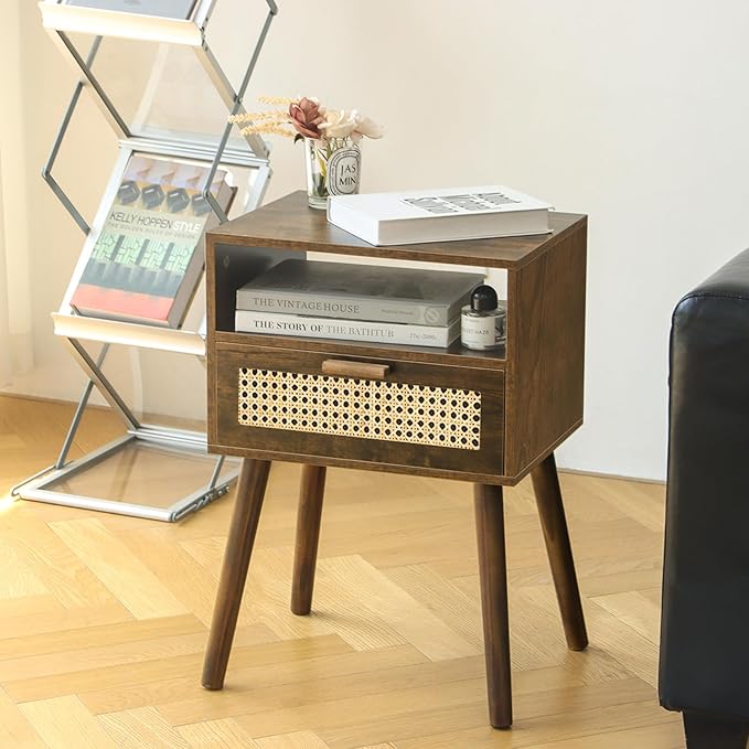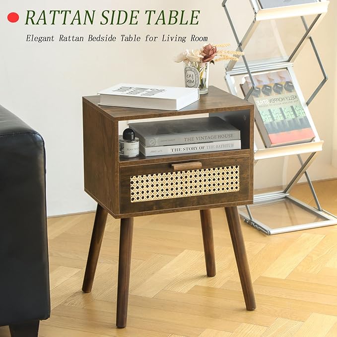 MaxSmeo Mid Century Nightstand, Rattan Side Table with Drawer, Wood Modern Bedside Table for Bedroom, Living Room and Small Spaces (Rustic Brown)