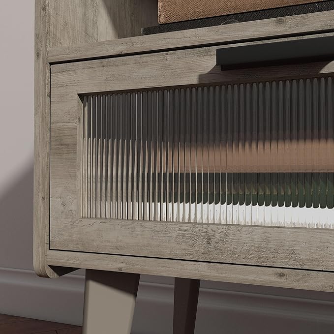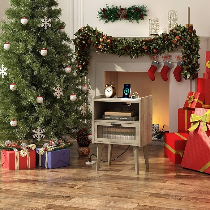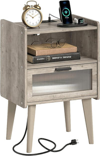 Nightstand with Charging Station, Bedside Tables Oak Grey End Table Side Table with 2 Tiers Storage Space, for Bedroom Living Room MLBZ07GE