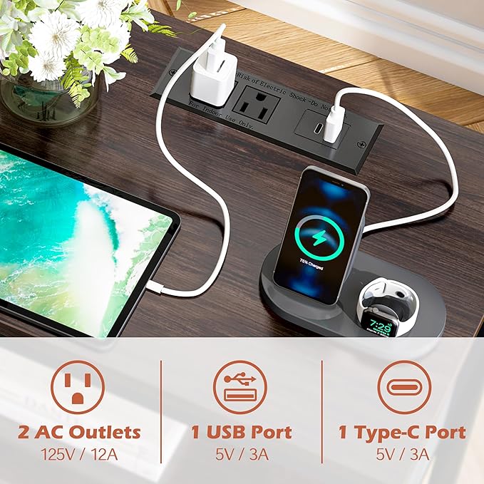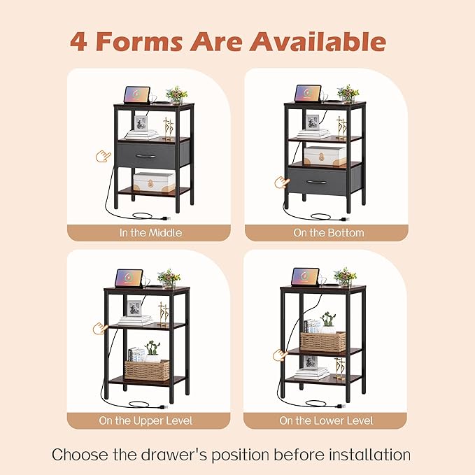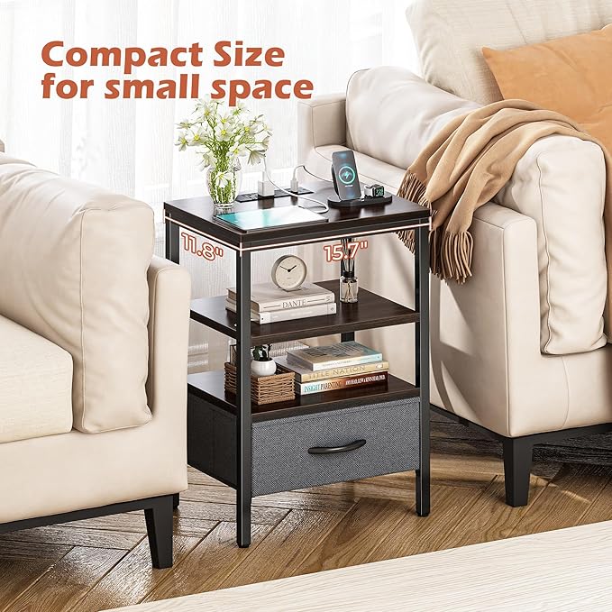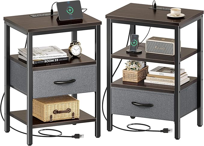 SUPERJARE Nightstand Set of 2, Bed Side Tables with Charging Station, Adjustable Fabric Drawer, Night Stand for Bedroom, 3-Tier Storage End Tables, Walnut Sale