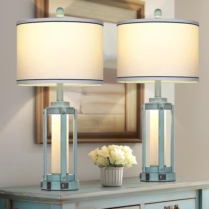 Table Lamp for Living Room, Vintage Rustic Industrial Farmhouse Lamps with USB A+C Charging Ports & AC Outlet, Beside Nightstand Metal Lamp with LED Night Light & Fabric Shade for Bedrooms