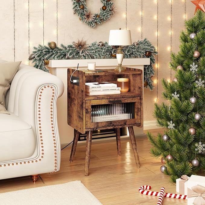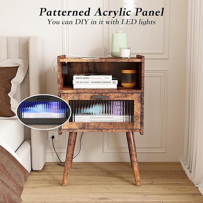 SOOWERY Mid Century Modern Nightstand with Charging Station, Bedside Tables with Acrylic Drawer, End Table Side Table with 2 Tiers Storage Space, for Bedroom, Living Room, Brown
