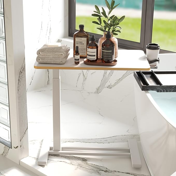 Medical Overbed Adjustable Bedside Table with Hidden Casters, Pneumatic Mobile Rolling Laptop Standing Desk with Tray for Home and Hospital Use, White
