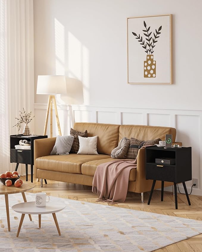 Black Nightstand with Outlet,Modern Bedside Table with Storage Drawer and Open Wood Shelf, for Living Room, Bedroom and Small Spaces, Accent Night Stand with Solid Wood Legs, Easy Assembly Sale