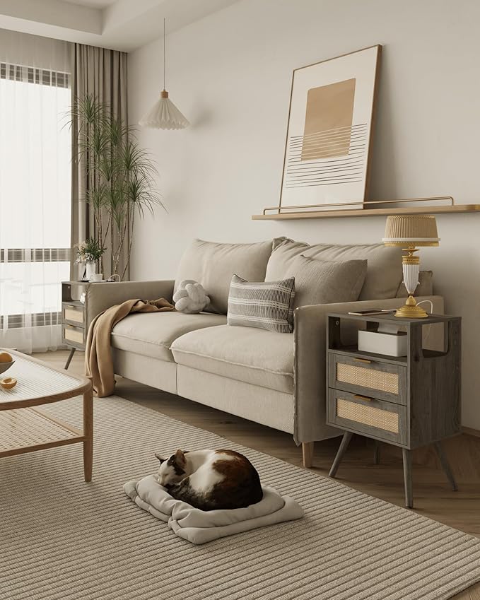 Rattan Nightstand with Charging Station,Modern Bedside Table with 2 Storage Drawer and Open Wood Shelf, for Bedroom and Small Spaces,Night Stand with Solid Wood Legs (Grey Oak)