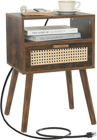 MaxSmeo Small Nightstand with Charging Station, Rattan Side Table Mid Century Modern Bedside Table for Bedroom, Living Room and Small Spaces, Solid Wood Legs (Rustic Brown)