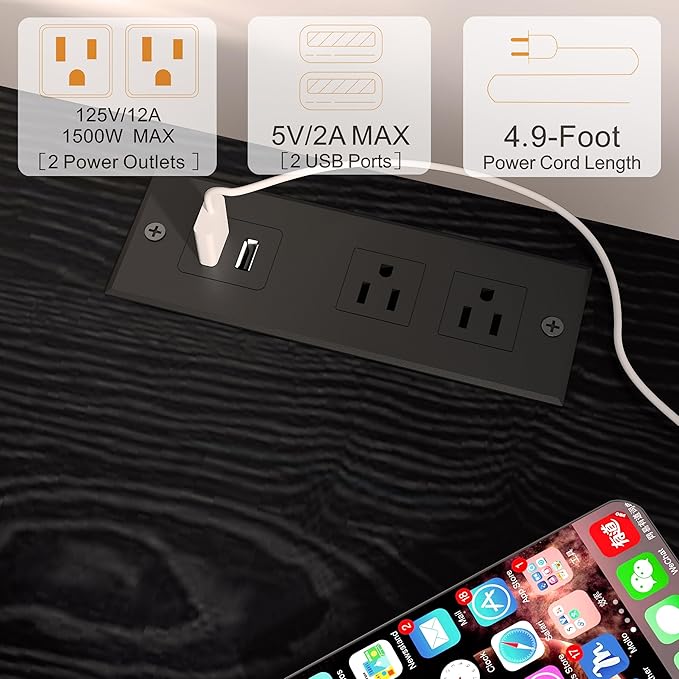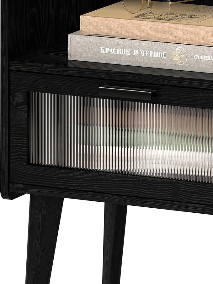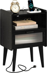 Nightstand with Charging Station, Bedside Tables with Glass Decorative Door, Black Wood Grain End Table, Side Table with 2 Tiers Storage Space for Bedroom Living Room CAMLBZ07XE