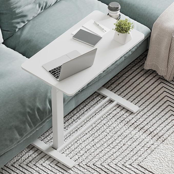 Medical Overbed Adjustable Bedside Table with Hidden Casters, Pneumatic Mobile Rolling Laptop Standing Desk with Tray for Home and Hospital Use, White Table Top + White Edging