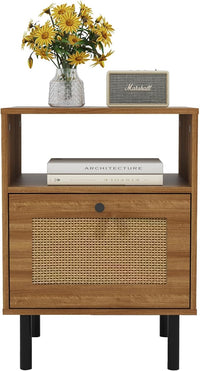 Rattan Nightstand with Storage Boho Modern Farmhouse Bedside Table with Drawer & Open Shelf Light Wood End Table for Bedroom, Living Room, Office, Dorm - Natural Walnut 0ak Color