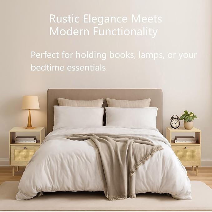 Rattan Nightstand with Storage Boho Modern Farmhouse Bedside Table with Drawer & Open Shelf Light Wood End Table for Bedroom, Living Room, Office, Dorm - Natural Walnut 0ak Color