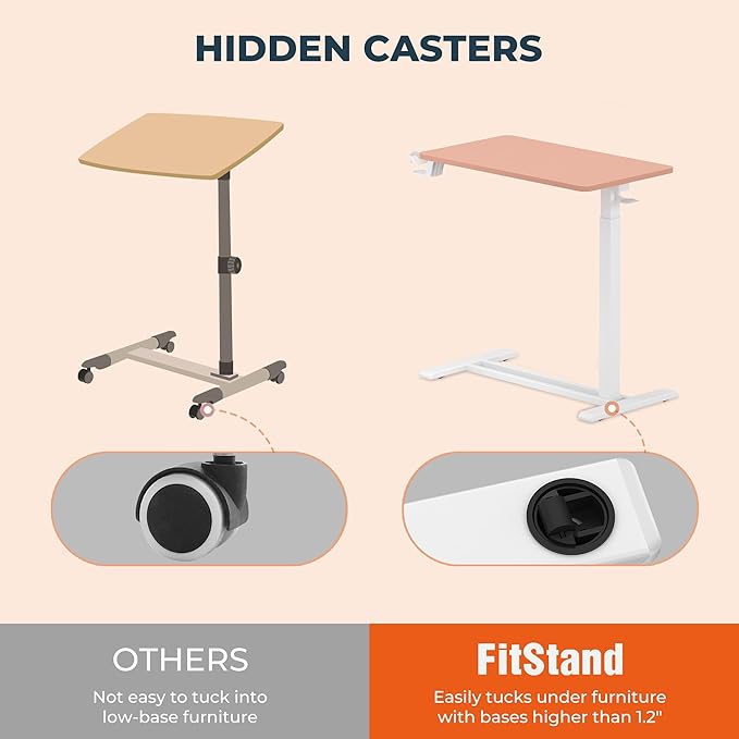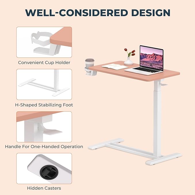 Medical Overbed Adjustable Bedside Table with Hidden Casters, Pneumatic Mobile Rolling Laptop Standing Desk with Tray for Home and Hospital Use, Pink