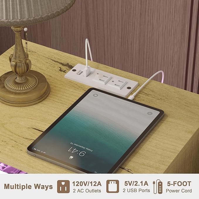 Nightstand with Charging Station, Bedside Table with Storage Drawer, Fluted Side Table for Living Room, Bedroom