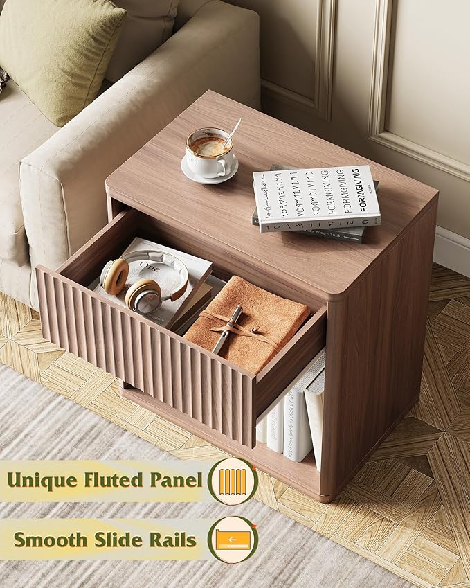 WLIVE Night Stand Set of 2, Wood Nightstand Sets with Storage Drawer and Open Shelf, Fluted Bedroom Nighstands, Mid Century Bed Side Table, End Tables Living Room, Dorm, Home Office, Carrocci Brown