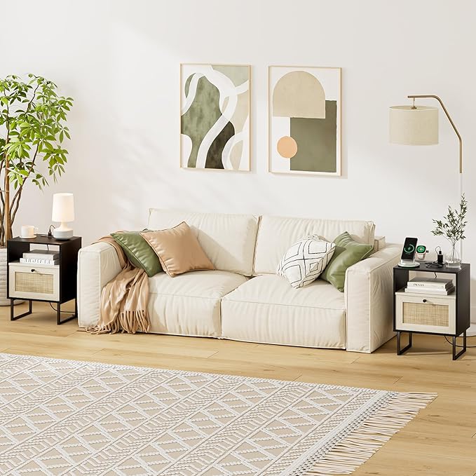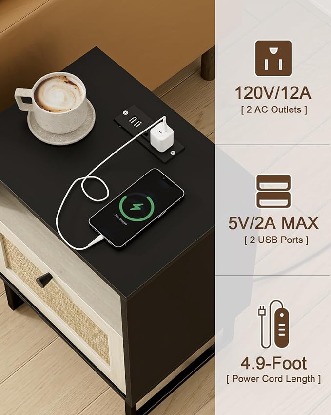 Rattan Nightstand with Charging Station, Boho Night Stand Farmhouse Wood Bedside Table with Storage and Open Shelf, End Side Accent Table for Bedroom,Living Room,Black and Oak