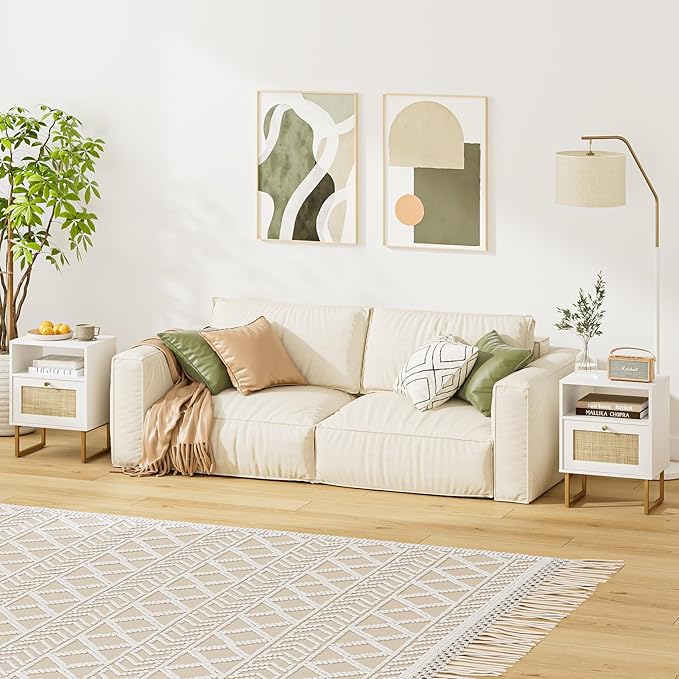 Rattan Nightstand, Mid Century Modern Night Stand,Boho Farmhouse Wood Bedside Table with Storage and Open Shelf, End Side Accent Table for Bedroom,Living Room,White