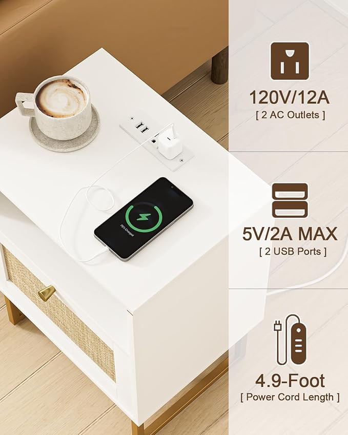 Rattan Nightstand with Charging Station, Mid Century Modern Night Stand,Boho Farmhouse Wood Bedside Table with Storage and Open Shelf, End Side Accent Table for Bedroom,Living Room,White