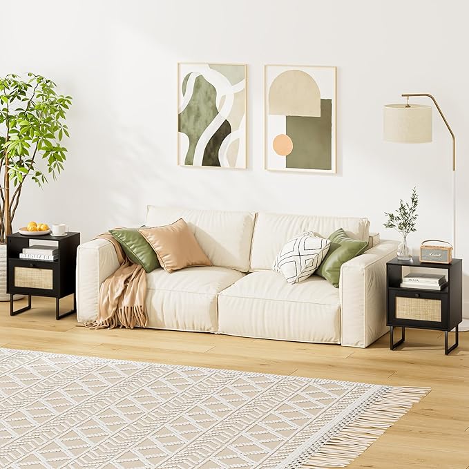 Rattan Nightstand, Boho Night Stand Farmhouse Wood Bedside Table with Storage and Open Shelf, End Side Accent Table for Bedroom,Living Room,Black