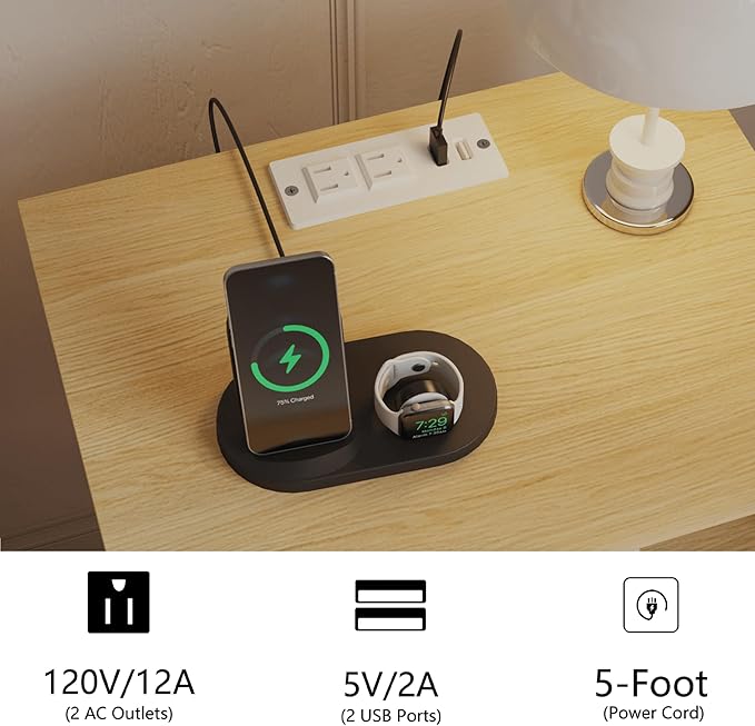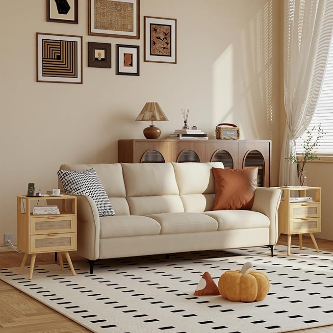 Rattan Nightstand with Charging Station,Farmhouse Bedside Table with 2 Storage Drawer and Open Wood Shelf, for Bedroom and Small Spaces,Night Stand with Solid Wood Legs (Yellow Oak-Outlet)