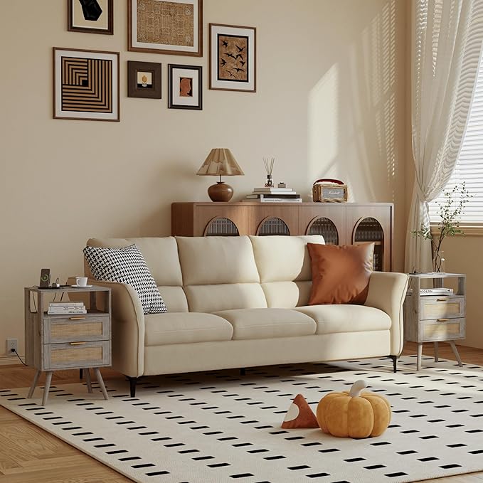 Rattan Nightstand with Charging Station,Farmhouse Bedside Table with 2 Storage Drawer and Open Wood Shelf, for Bedroom and Small Spaces,Night Stand with Solid Wood Legs (Grey Oak-Outlet)