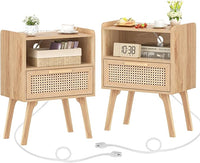 Lerliuo Rattan Nightstands Set of 2 with Charging Station, Boho Night Stand with Handmade Natural Rattan Drawer and Open Shelf, Side End Tables with Solid Wood Legs for Bedroom, Dorm, Small Spaces