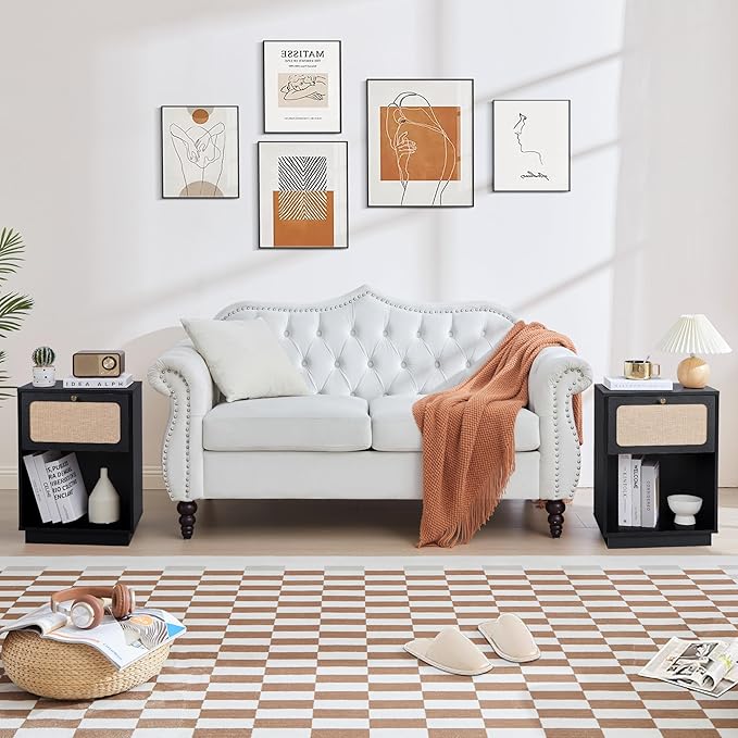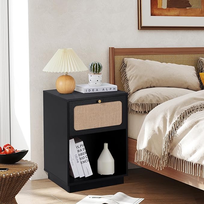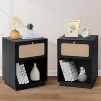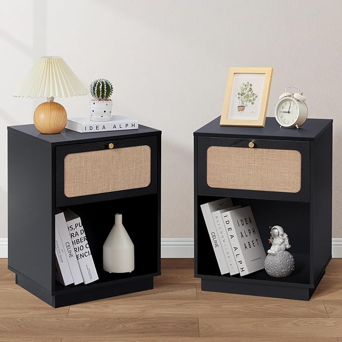 Mid Century Night Stand Set of 2, Modern Nightstand with Drawer & Curved Linen Panel, Farmhouse End Table Wood Bedside Table Small Side Tables for Small Space, Bedroom (Black)