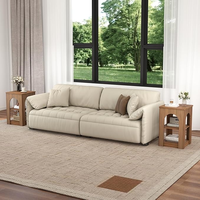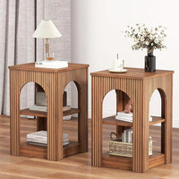 End Table Set of 2, Mid-Century Modern Side Table with 3-Tier Storage Shelves and Arched Carving Lines, Square Fluted Nightstand for Living Room, Bedroom, or Office (2, Walnut)