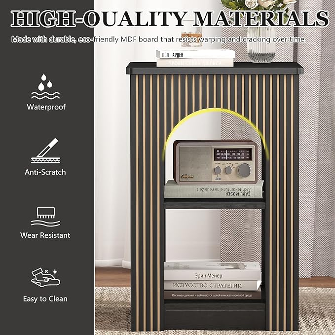 End Table Set of 2, Mid-Century Modern Side Table with 3-Tier Storage Shelves and Arched Carving Lines, Square Fluted Nightstand for Living Room, Bedroom, or Office (2, Black)
