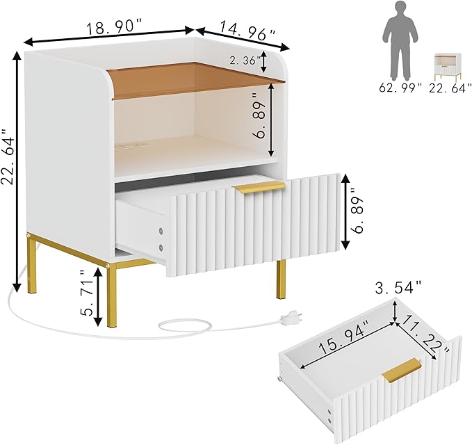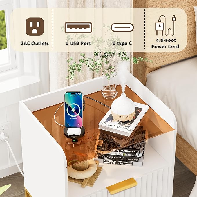 Nightstand Set of 2 with Charging Station, Mid Century Modern Night Stand, Fluted Bedside Table with Glass Top & Metal Legs, Wood End Table for Bedroom, Living Room (White)