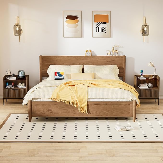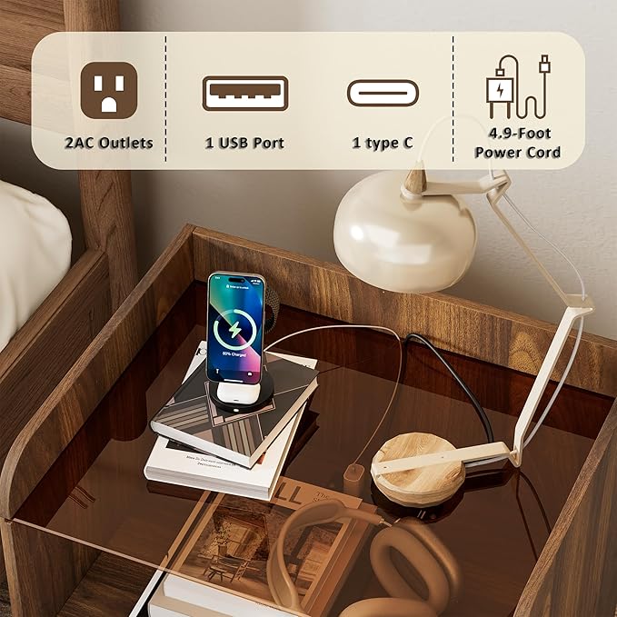 Nightstand Set of 2 with Charging Station, Mid Century Modern Night Stand, Fluted Bedside Table with Glass Top & Metal Legs, Wood End Table for Bedroom, Living Room (Walnut)