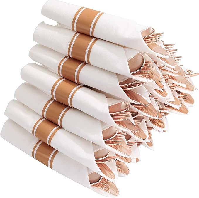 Supernal Set of 30packs,Rose Gold Plastic Silverware, Pre Rolled Napkin with Cutlery, Disposable Silverware with Rose Gold Linen Napkin, Wrapped Plastic Silverware Set Suit for Party,Wedding