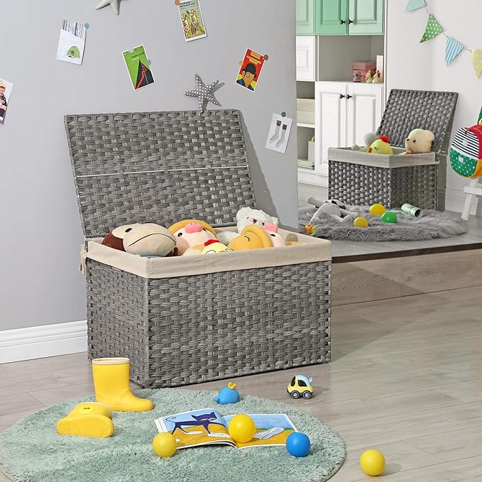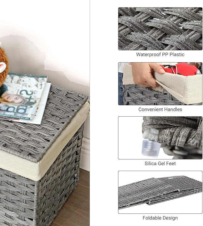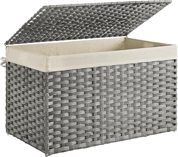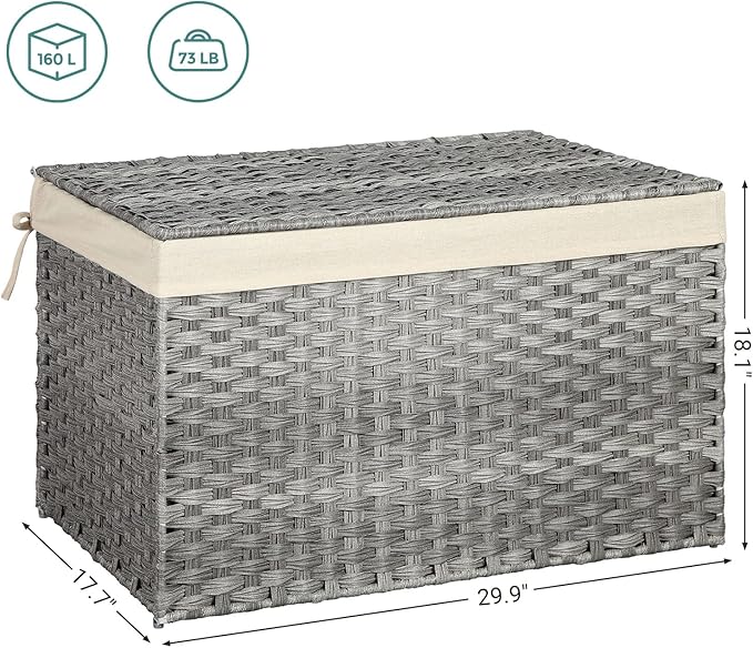 SONGMICS Storage Basket with Lid, 42.3 Gallon (160L) Storage Bin, Woven Blanket Storage Basket with Handles, Foldable, Removable Liner, Metal Frame, for Bedroom, Laundry Room, Gray URST76WG