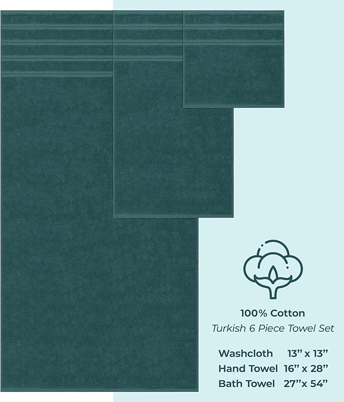 American Soft Linen Luxury 6 Piece Towel Set, 2 Bath Towels 2 Hand Towel 2 Washcloths, 600 GSM 100% Cotton Turkish Towels for Bathroom, Teal Towel Sets