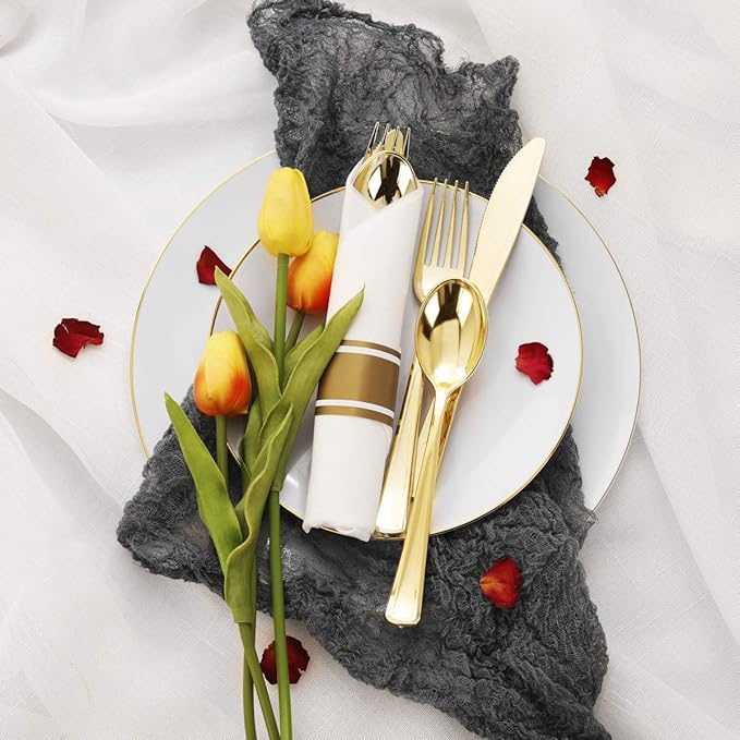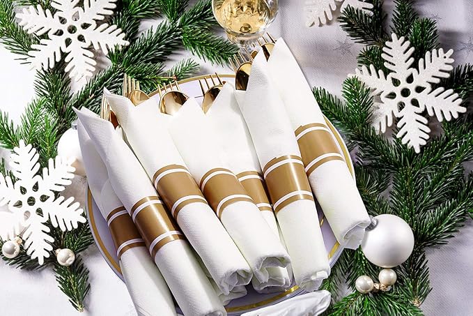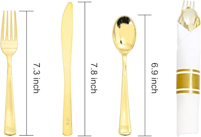 Supernal 60 Pack Pre Rolled Napkins with Gold Plastic Silverware, Premium Disposable Gold Wrapped Cutlery Set Includes: 60 Forks 60 Knives 60 Spoons 60 Napkin for Party