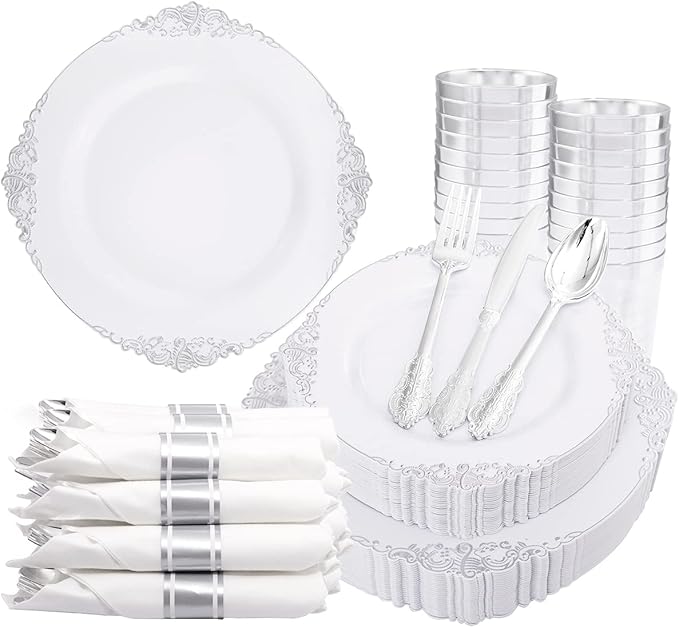 Liacere 350PCS Silver Plastic Plates&Pre Rolled Napkins for 50 Guests - Plastic Dinnerware Sets 100Silver Disposable Plates, 150Silver Silverware, 50Cups and 50Napkins for Wedding