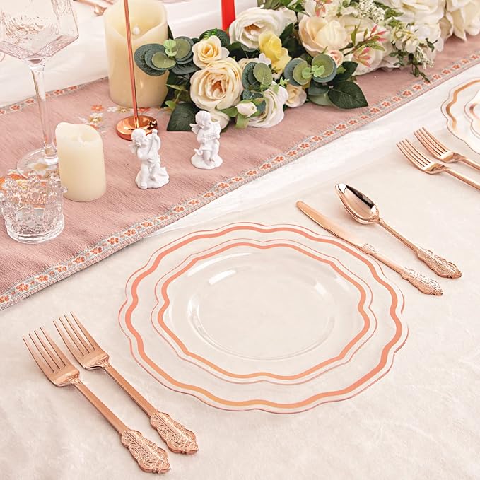 NOCCUR 150PCS Rose Gold Plastic Plates&Rose Gold Silverware-Include 30Dinner Plates, 30Salad plates, 90 Disposable Rose Gold Utensils- Ideal for Weddings, Party,Shower