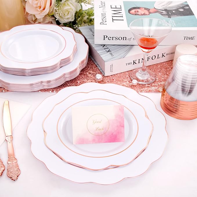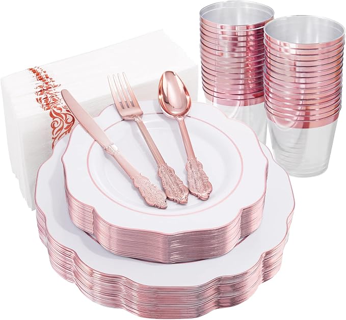 NOCCUR 175PCS Rose Gold Plastic Plates with Disposable Silverware - Include 25Dinner Plates, 25Dessert Plates, 25Forks, 25Knives, 25Spoons, 25Cups, 25Napkins for Wedding&Party