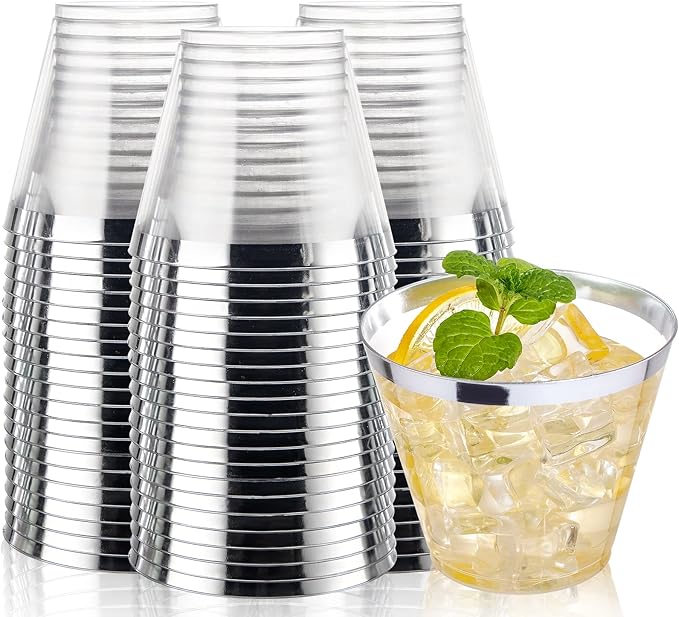 I00000 200pcs Silver Disposable Plastic Cups - 9 oz Clear Plastic Old Fashioned Tumblers - Fancy Wedding & Party Cups - Elegant Silver Wine & Cocktail Glasses