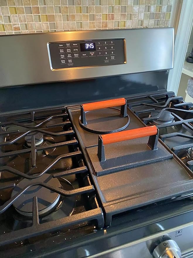 Burger Press 7.08" Round & 8.3”X4.3”Rectangle Heavy-Duty Cast Iron Smash Meat Steak With Wood Handle for Blackstone Camp chef Pitboss Weber Treager Griddle Grills (Round & Rectangle)