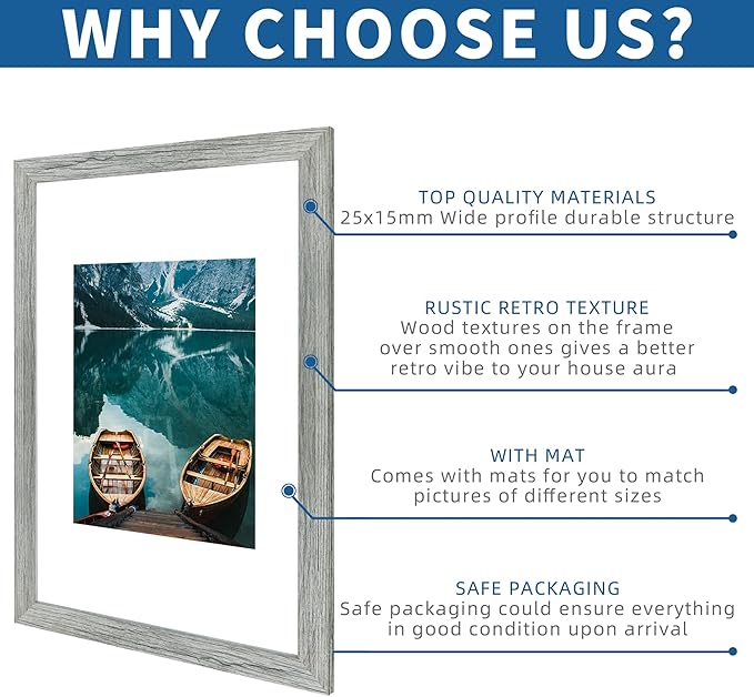 12x18 Frame Set of 2, Rustic Grey Wood Style, Display 12 x 18 Poster without Mat or 8.5x11 Picture with Mat, Wall Mounting Horizontal and Vertical