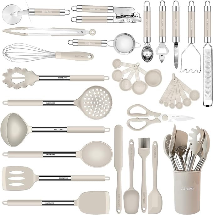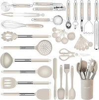 Kitchen Utensils Set-Silicone Cooking Utensils-33pcs Non-Stick Silicone Cooking Kitchen Utensils Spatula Set with Holder-Best Kitchen Cookware with Stainless Steel Handle (Khaki)