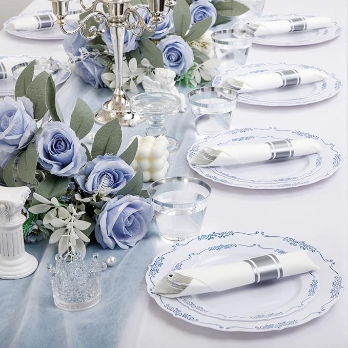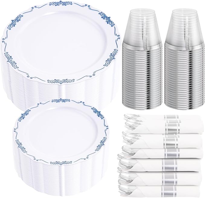 DaYammi 350Pcs Blue and White Plastic Plates Disposable Blue Plates for Party Include 50 Dinner plate,50 Dessert plate- 50 Per Rolled Napkins with Silver Cutlery- 50 Disposable Cups 9 OZ for Wedding