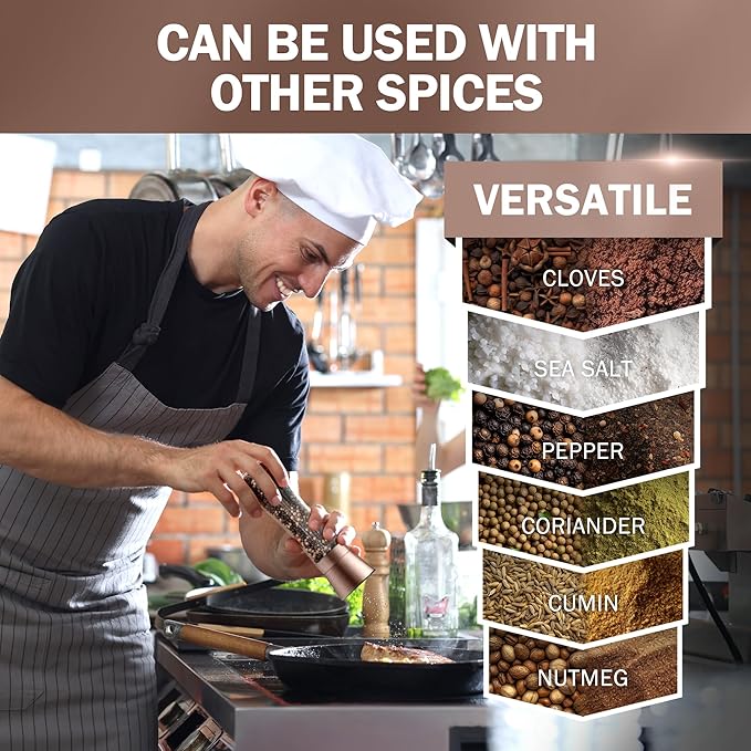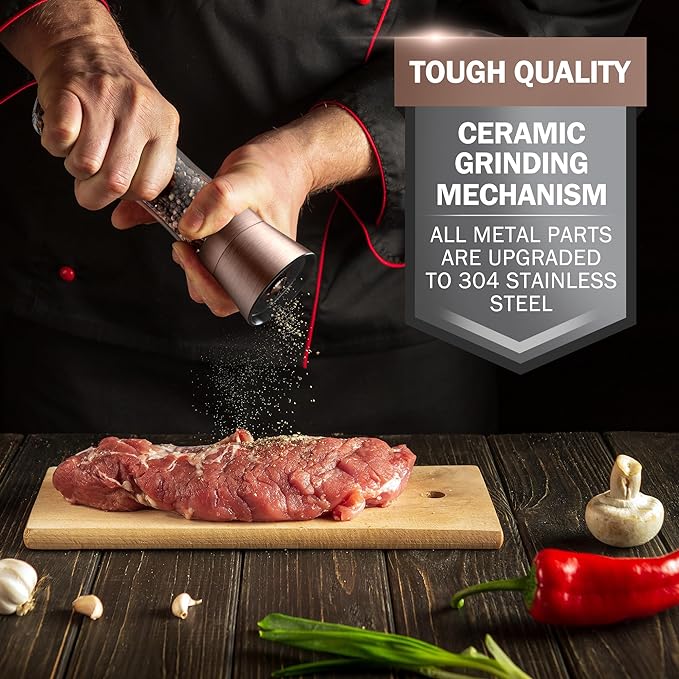 Home EC Original Copper Salt and Pepper Grinder Set of 2 - Adjustable Ceramic Grinder - Tall Glass Salt and Pepper Shakers With Funnel and Ebook - Kitchen Spice Mill - Copper Kitchen Accessories