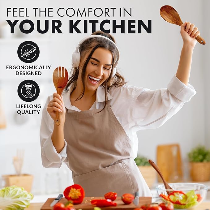 Zulay Kitchen 10-Piece Wooden Spoons for Cooking - Smooth Finish Teak Wooden Utensils for Cooking - Soft Comfort-Grip Wood Spoons for Cooking - Non-Stick Wooden Cooking Utensils - Wooden Spoon Sets