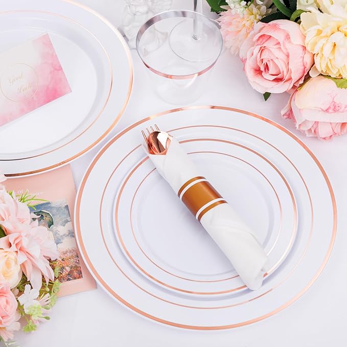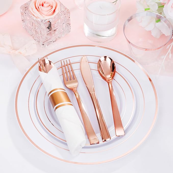 DaYammi 350PCS Rose Gold Plastic Dinnerware Set for 50 Guests, Plastic Plates for Party Include: 50 Dinner Plates, 50 Dessert plates,50 Pre Rolled Napkins with Rose Gold Silverware,50 Cups for Wedding